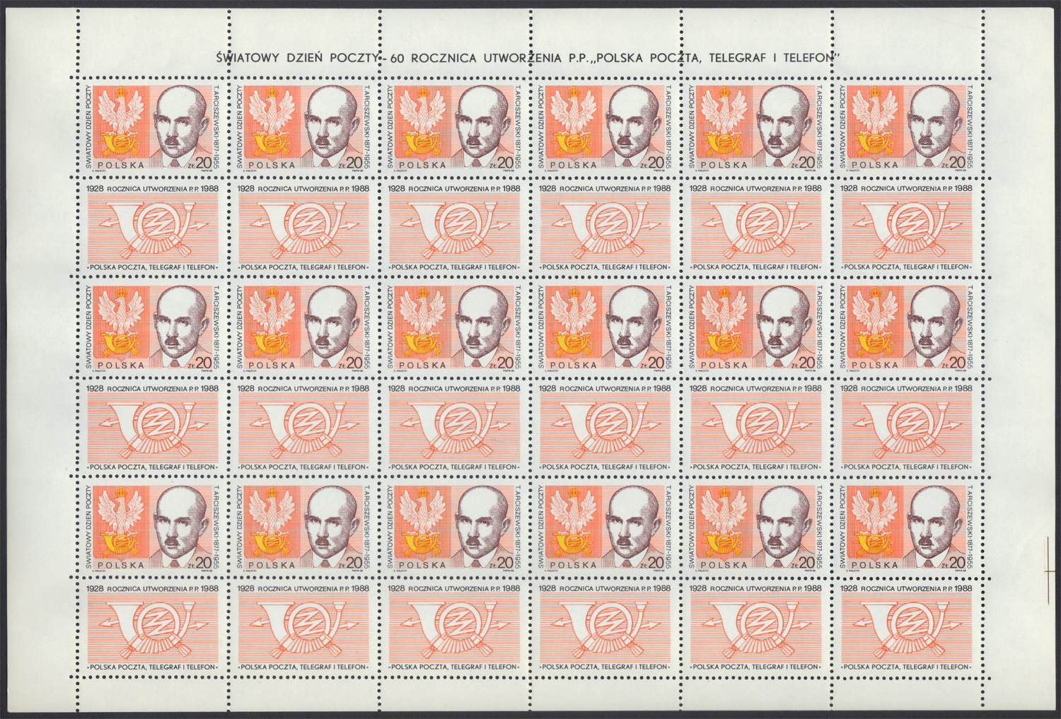 1988 Światowy Dzień Poczty i 60. rocznica utworzenia P.P. "POLSKA POCZTA TELEGRAF I TELEFON", arkusz czysty; bardzo dobry stan zachowania. | Fi.3016 ark. Mi.3163 |