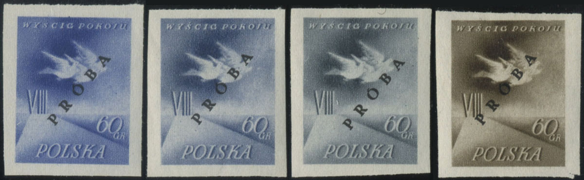 1955 VIII Wyścig Pokoju, cztery luzaki z nadrukiem PRÓBA. | Fi.772P Mi.906P |