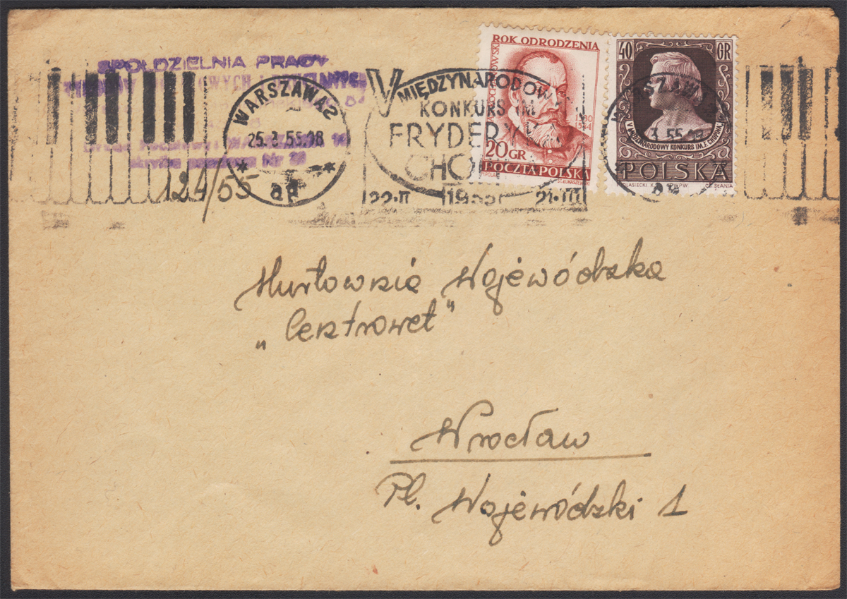 1955 "V MIĘDZYNARODOWY KONKURS IM. FRYDERYKA CHOPINA" Warszawa 2, czytelna odbitka okolicznościowego stempla wirnikowego na kopercie listu wysłanego 25.2 z Warszawy do Wrocławia; bardzo dobry stan zachowania; temat - CHOPIN (Myślicki 55 101). | Fi.683, 759 Mi.821, 899 |
