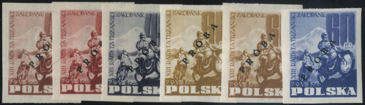 1955 VII Rajd Tatrzański, komplet znaczków ciętych z nadrukiem PRÓBA. | Fi.786-7P Mi.928-9P |