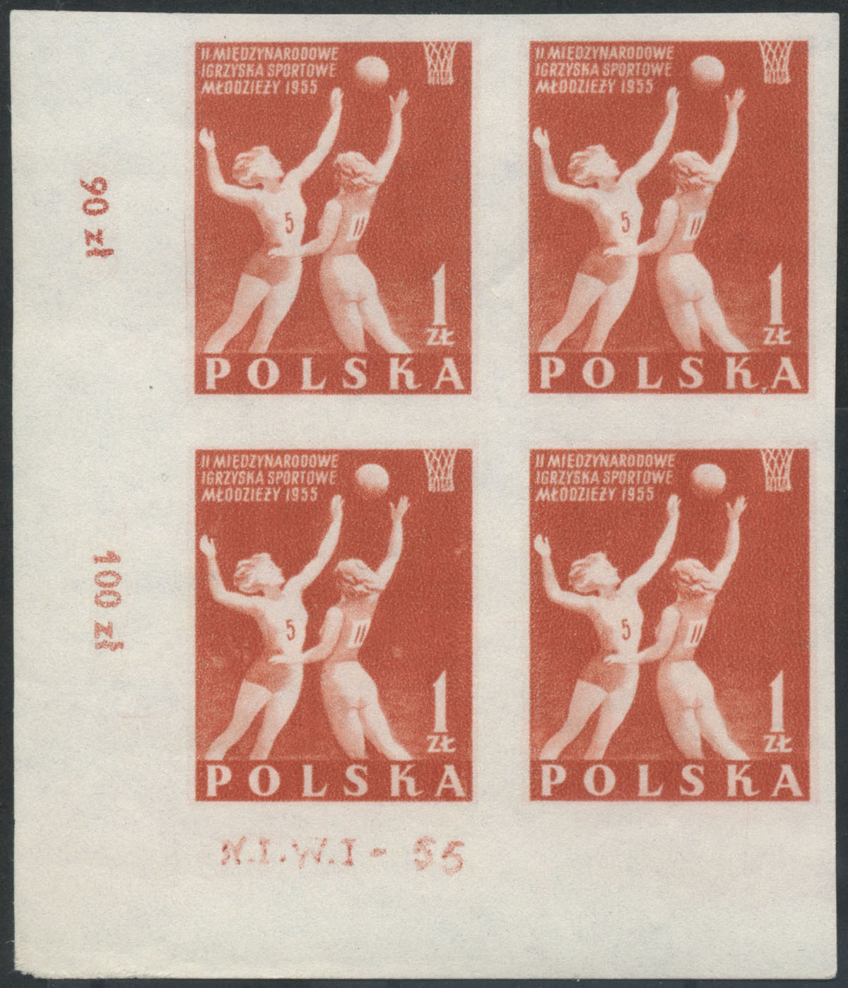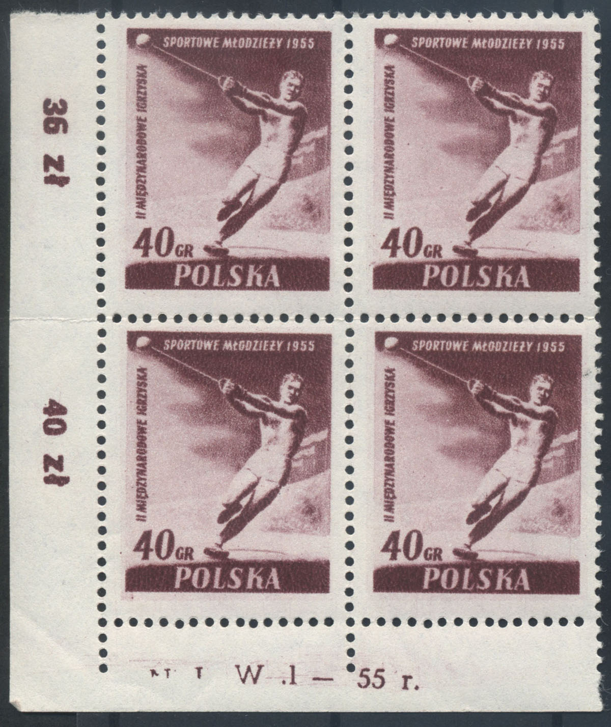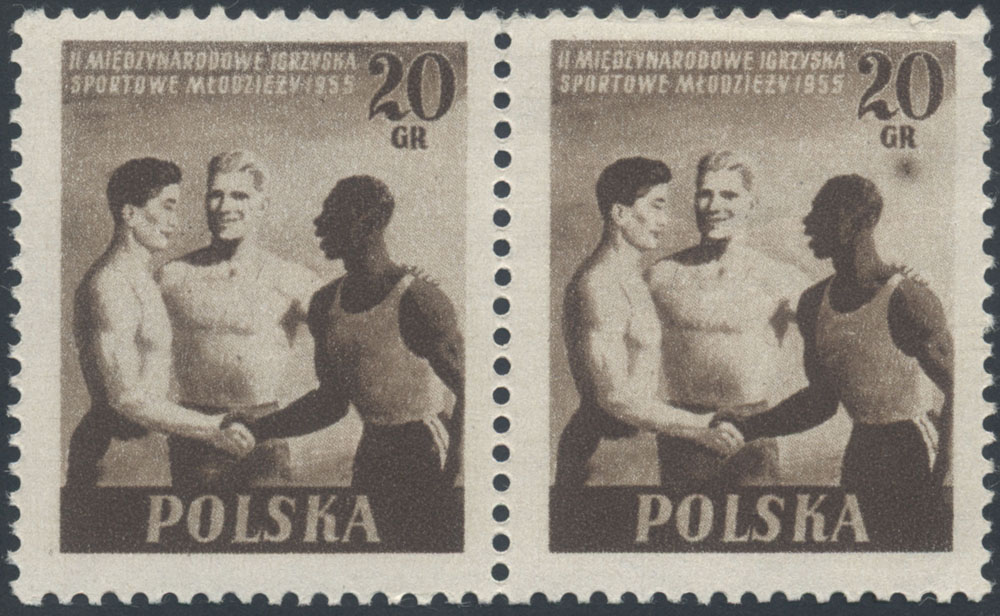 1955 II Międzynarodowe Igrzyska Sportowe Młodzieży, prawy znaczek z błędem "plama pod GR", druk na pomarszczonym papierze. | Fi.790B B1 Mi.934A |