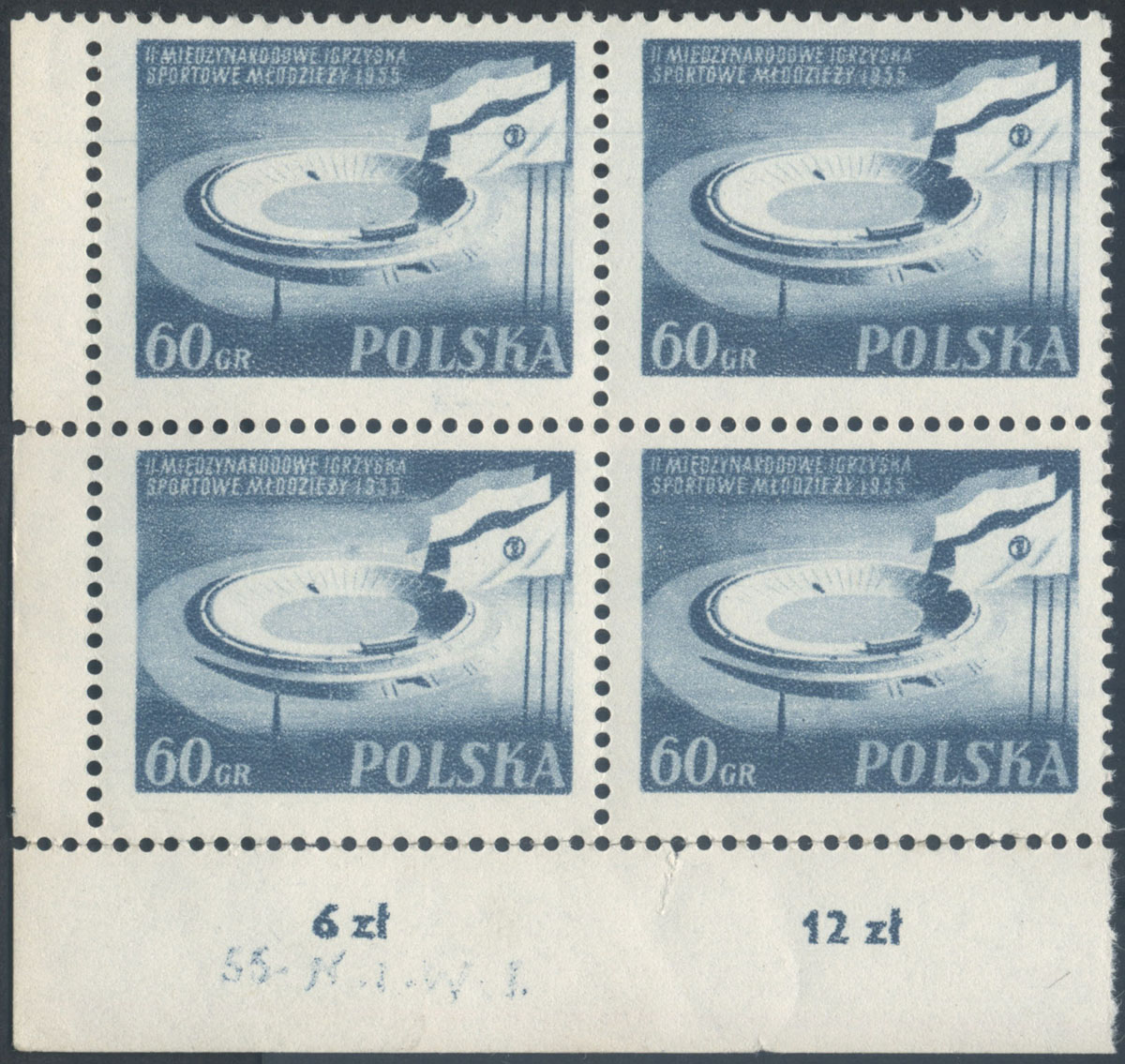1955 II Międzynarodowe Igrzyska Sportowe Młodzieży, prawy znaczek z błędem "plama pod GR". | Fi.790B B1 Mi.934A |