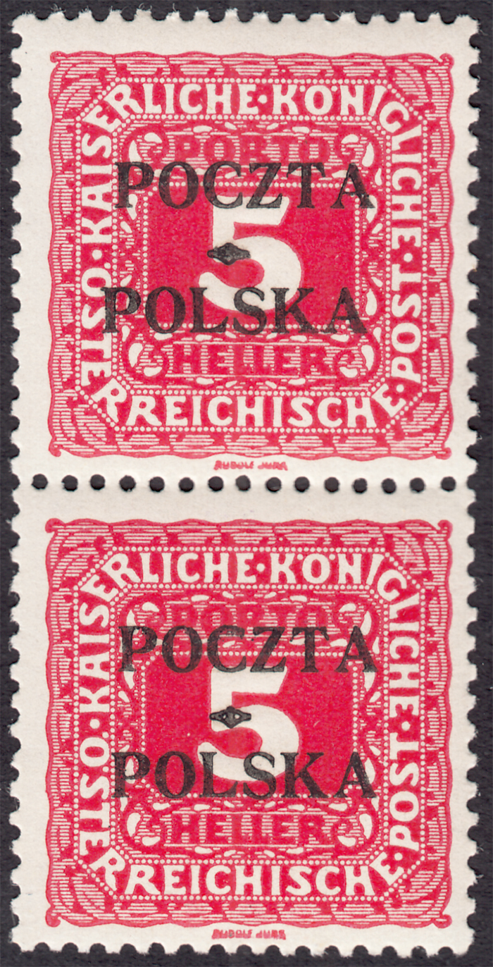 1919 wydanie krakowskie, parka pionowa znaczków za 5 h. z nadrukami formy IIA poz.29/39, piękny stan z pełną oryginalna gumą, opis pozycji Sutcliffe, gwarancja. | Fi.D1 |