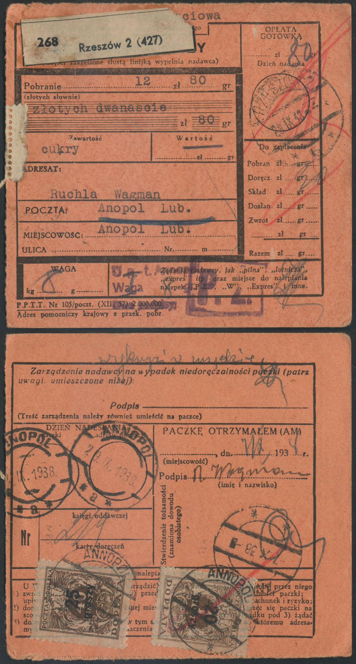 1938 przekaz paczkowy z Rzeszowa do Annopola, opłaty doręczeniowe pobrane znaczkami dopłaty. | Fi.D83, D85 |