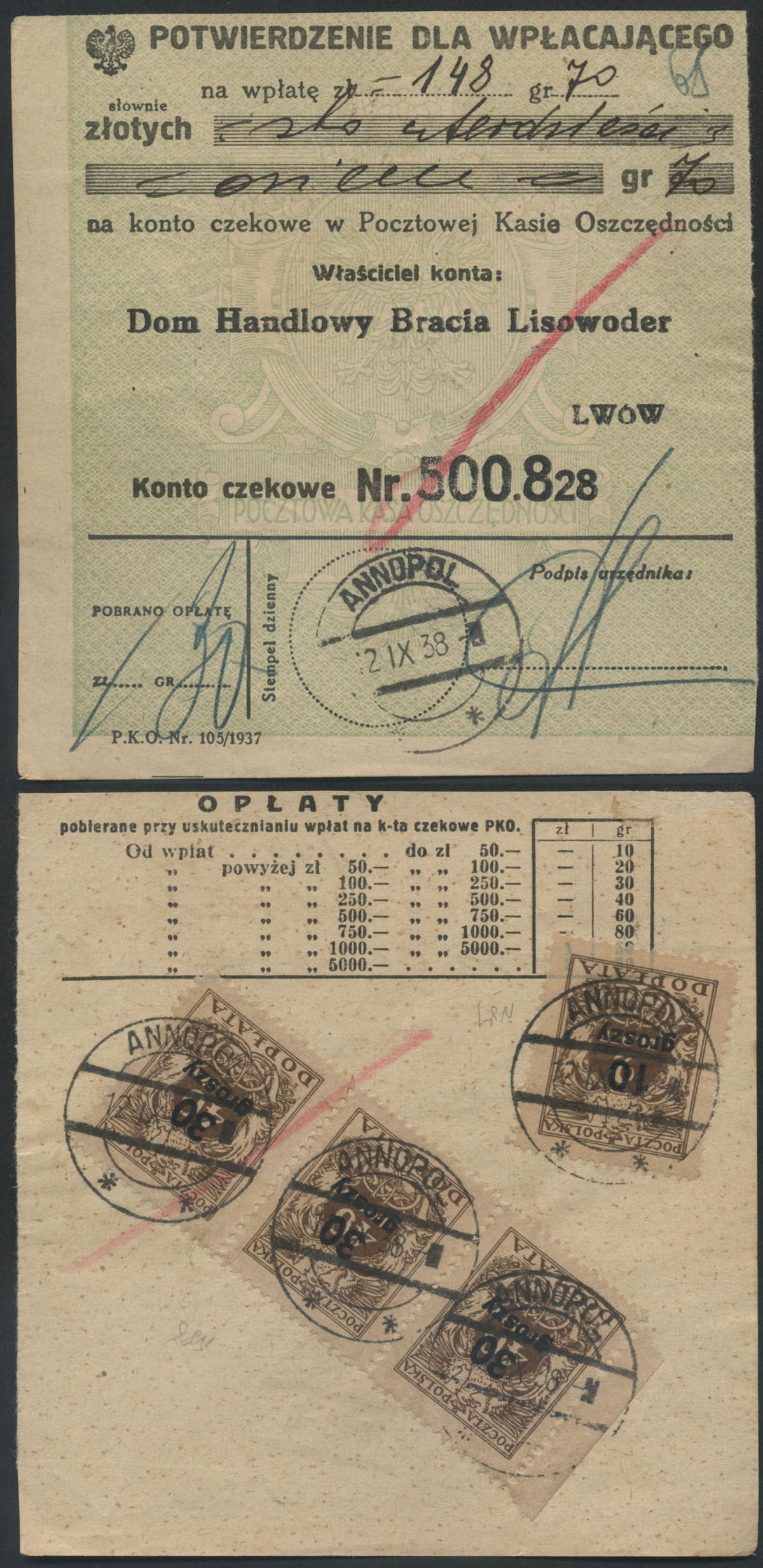 1938 potwierdzenie wpłaty Pocztowej Kasy Oszczędności opłacone znaczkami dopłaty. | Fi.D81, D86 |