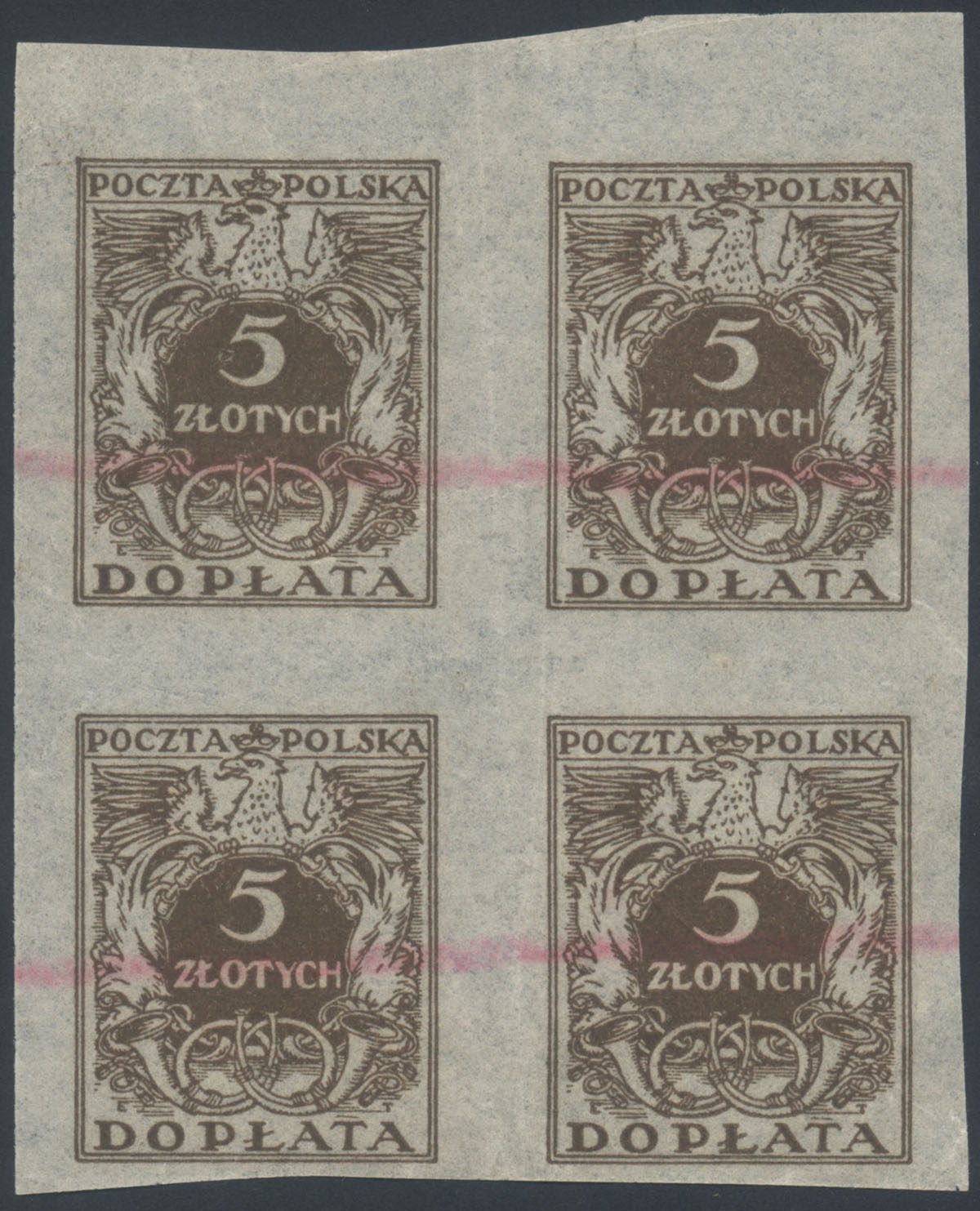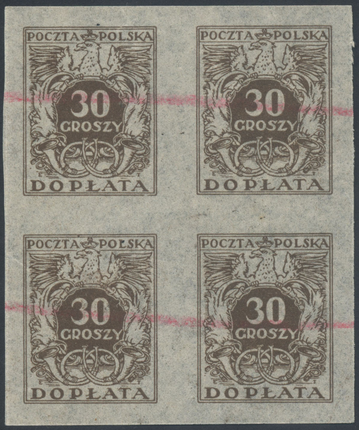 1924 orzeł z tarczą, czworoblok niegumowanych ciętych prób arkuszowych kreślonych czerwonym tuszem, gwarancja Ryblewski. | Fi.D79 |