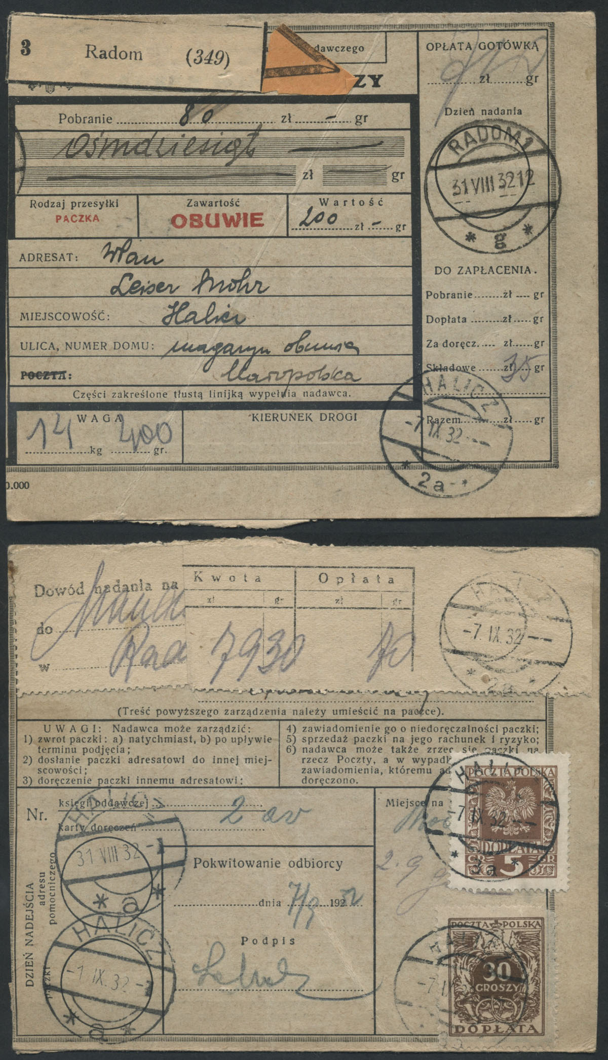 1932 przekaz paczkowy z Radomia do Halicza, opłaty doręczeniowe pobrane znaczkami dopłaty. | Fi.D73, D80 |