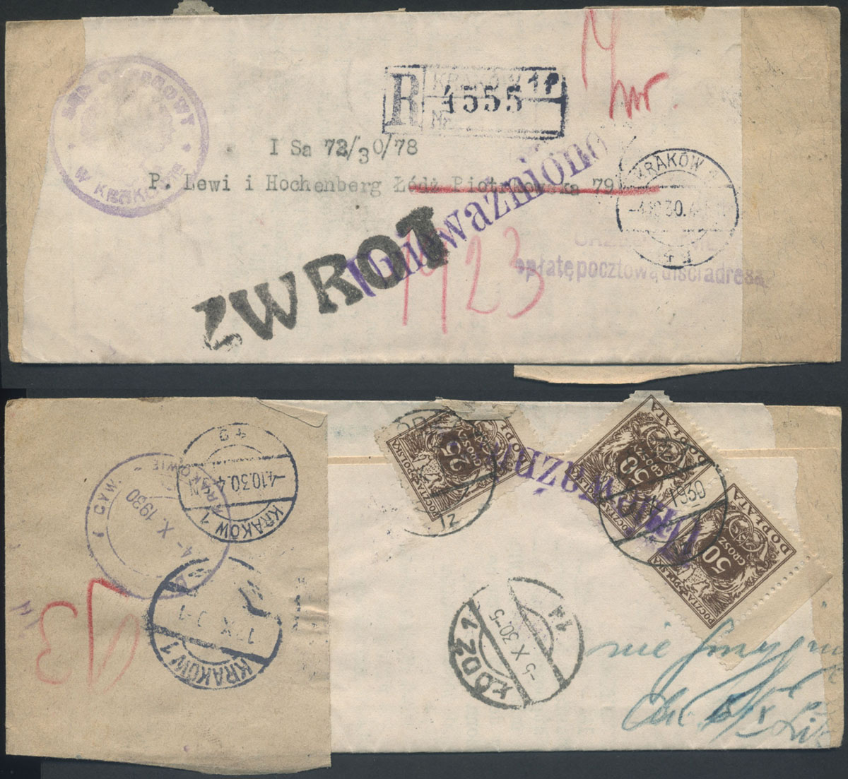 1930 sądowy list polecony z Krakowa do Łodzi, stempel "URZĘDOWNIE / opłatę pocztową uiści adresat", celem pobrania opłaty w Łodzi naklejono i ostemplowano znaczki dopłaty, adresat nie przyjął listu, na znaczkach przystawiono stempel "Unieważniono" i odesłano do nadawcy. | Fi.D72, D75 |