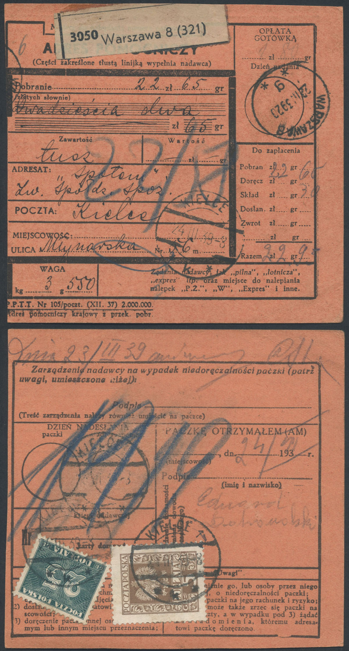 1938 przekaz paczkowy z Kielc do Brześcia zwrócony do nadawcy, na odwrocie znaczki dopłaty. | Fi.D83, D87 |