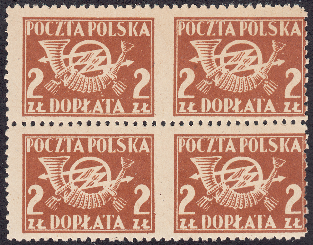 1945 trąbka pocztowa, czworoblok znaczków dopłaty za 2 zł. bez perforacji pionowej pomiędzy znaczkami, bardzo ładny stan zachowania, gwarancja. | Fi.D101 MK |