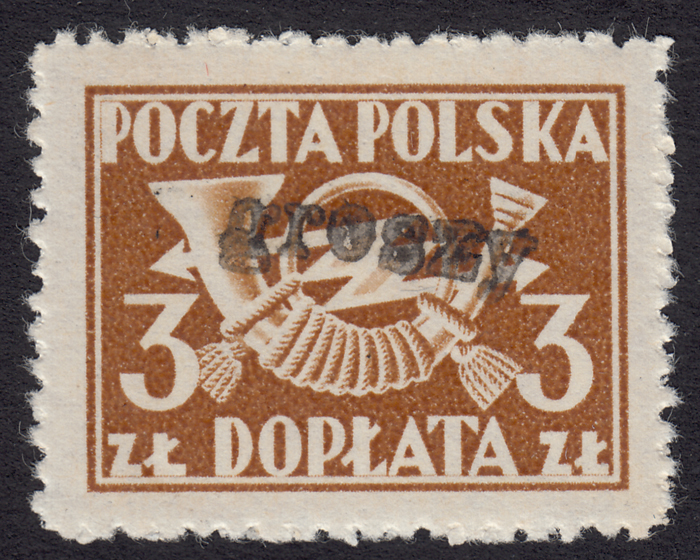 1950 "groszy - lokalny", Trzebicz, trąbka pocztowa, znaczek dopłaty za 3 zł. z czarnym stempelkiem typu 42, gwarancja firmowa K.Gryżewski, Krawczyk. | Fi.D113 Mi.P127A |