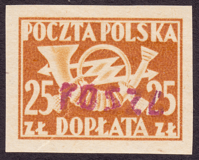 1950 "groszy - lokalny", Brzeziny, trąbka pocztowa, nienotowany dotąd znaczek dopłaty za 25 zł. z czarnym stempelkiem typu 34, gwarancja Krawczyk. | Fi.D115 Mi.P132A |