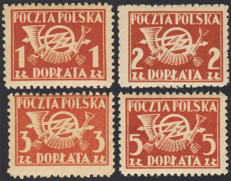 1945 trąbka pocztowa, parka znaczków dopłaty za 5 zł. bez perforacji pionowej pomiędzy znaczkami, katalogowany jest tylko brak ząbkowania poziomego, bardzo ładny stan zachowania, gwarancja Walocha. | Fi.D103 MK |