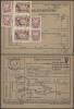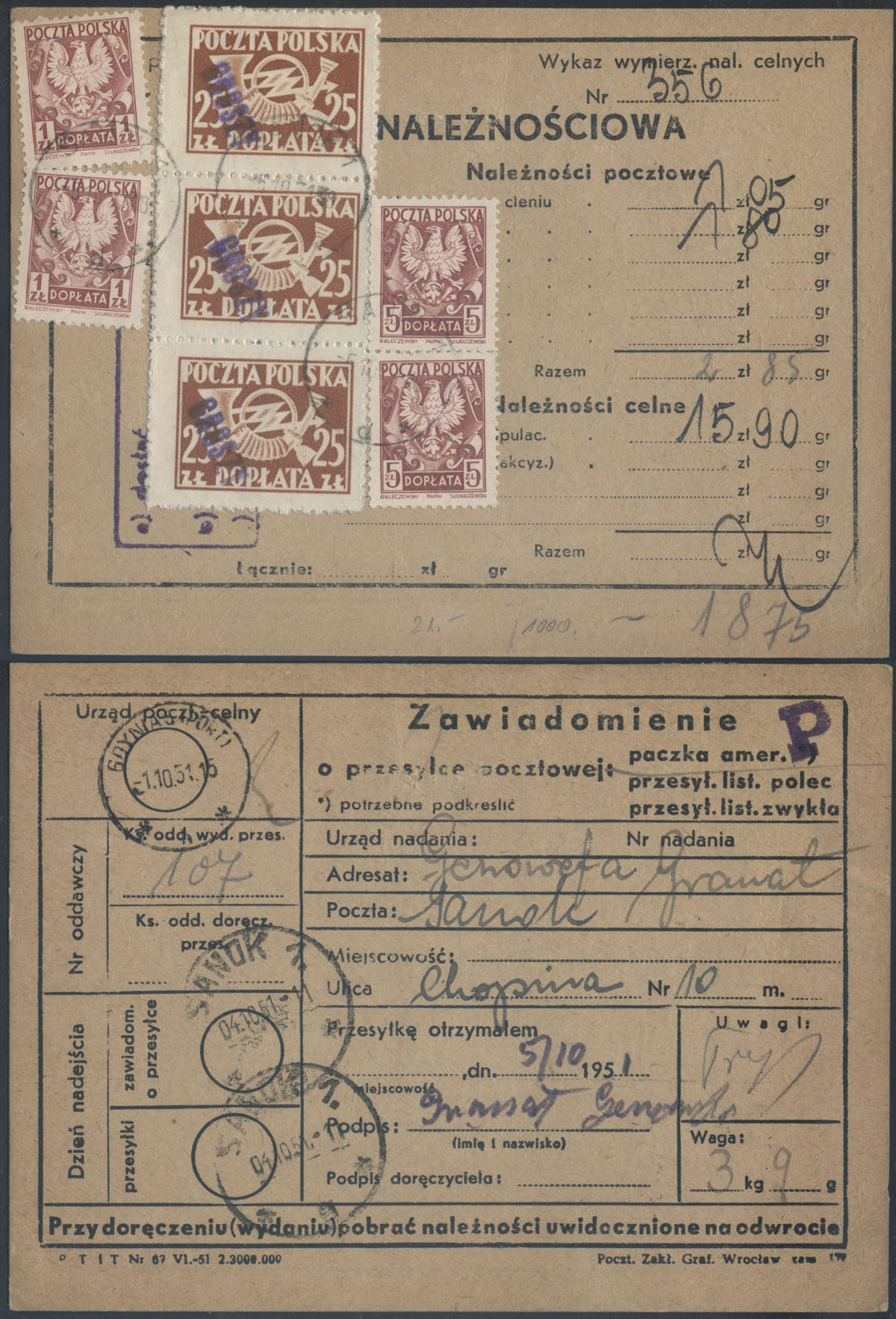 1951 groszy, zawiadomienie o przesyłce pocztowej z Sanoka opłacone znaczkami z nadrukiem groszy typ 3 w barwie fioletowej. | Fi.D115, D134, D136 |
