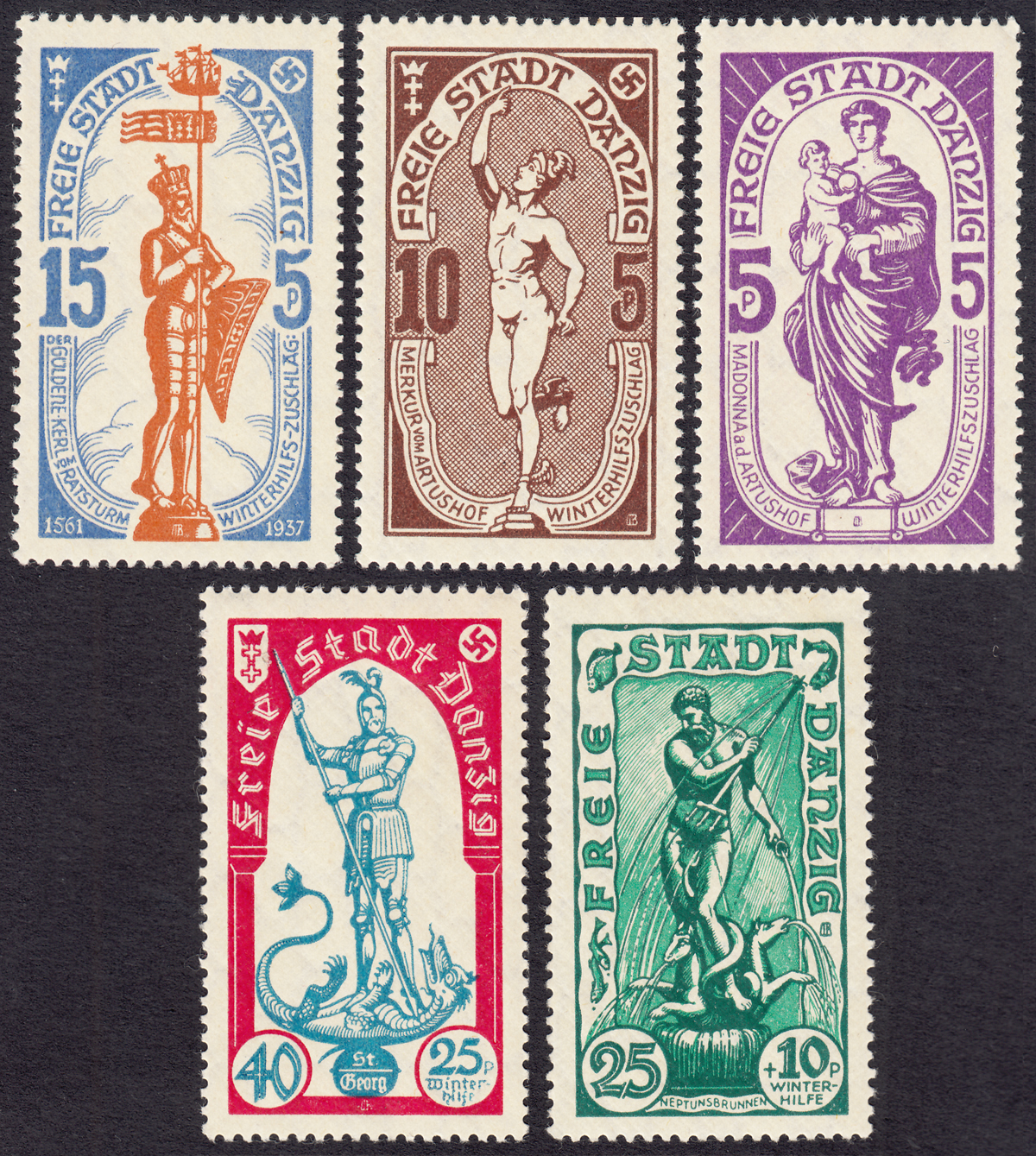 1937 wydanie z dopłatą na Pomoc Zimową, Zabytki Gdańska (III), seria czysta ze śladami lub delikatną podlepką. | Fi.274-78 Mi.276-80 |