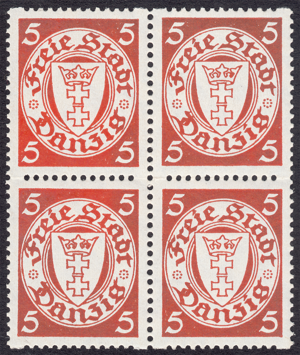 1938-39 wydanie obiegowe, nowy nakład na papierze ze znakiem wodnym "swastyka", czworoblok czystych znaczków do automatów za 5 Pf. w oksydowanym kolorze pomarańczowym, rzadkie i wyżej wyceniane w parkach poziomych (Fi.300.-). | Fi.287R + 287R Mi.290D + 290D |