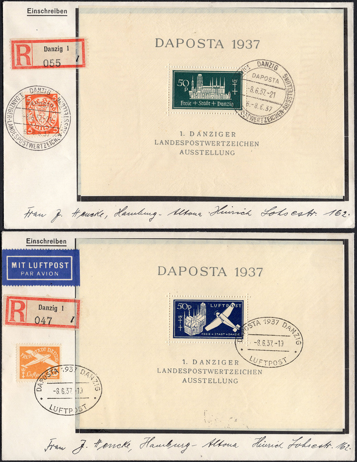 1937 Wystawa Filatelistyczna DAPOSTA 1937, komplet dwóch bloków na listach poleconych wysłanych z wystawy do Niemiec, na odwrocie stemple odbiorcze. | Fi.bl.1, 2 |