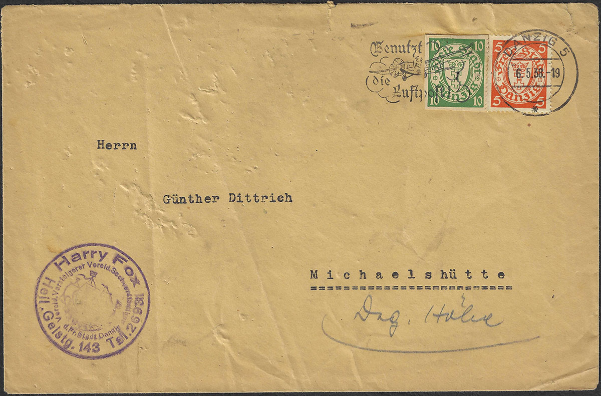 1938 list firmowy z Gdańska do Niemiec, stempel okolicznościowy promujący pocztę lotniczą "Benitz di Flugpost", znaczek za 10 fen. cięty z trzech stron (do automatów???). | Fi.287, 289 |