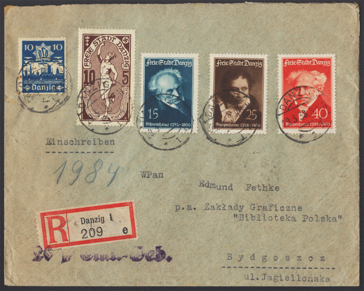 1938 PRZESYŁKA POLECONA PRZYJĘTA POZA GODZINAMI URZĘDOWANIA, wyznaczone urzędy pełniące służbę całodobowo mogły przyjmować przesyłki polecone nadane poza godzinami urzędowymi (od 20 do 8 rano), podlegały one dodatkowej opłacie taryfowej (tu 20 Pf), nadawca mógł ją uiścić przez naklejenie odpowiedniego znaczka - list polecony II klasy (opłata taryfowa 80 Pf) nadany 29.3 poza godzinami urzędowania (dodatkowa opłata 20 Pf) w urzędzie Gdańsk 1 do Bydgoszczy, nadawca frankując przesyłkę uwzględnił tę nadpłatę naklejając znaczki za 100 Pf, w urzędzie oznaczono przesyłkę stempelkiem "20 P.Einl.Geb." (Einlieferungsgebühr - Wolff 116) potwierdzającym pobranie dodatkowej opłaty; datownik nadawczy DANZIG 1 z wyróżnikiem "*h" z datą 29.3.38 3-5N, na odwrocie datownik odbiorczy; walor w bardzo dobrym stanie zachowania. | Fi.263, 275, 279-81 Mi.263, 277, 281-83 |