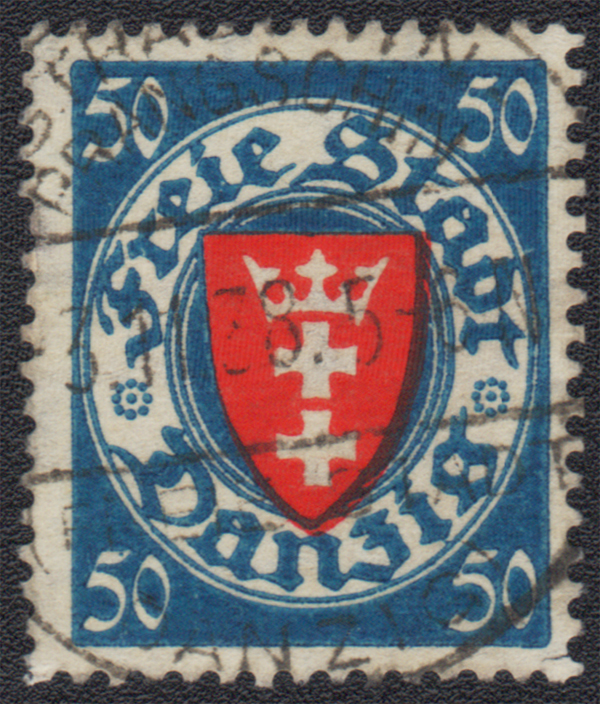 1938 STRASCHIN-PRANGSCHIN (FREIE STADT DANZIG) - Straszyn, Prędzieszyn, znaczek za 50 Pf "Herb Gdańska w owalu" skasowany czytelnie odciśniętym datownikiem; bardzo dobry stan zachowania. | Fi.194 Mi.200 |
