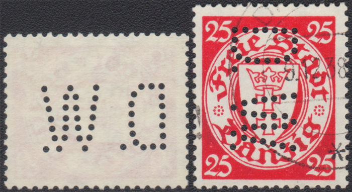 1938 perforacja firmowa DW - Danziger Werft AG (Stocznia Gdańska), znaczek za 25 Pf herb Gdańska w owalu z perforacją firmową, skasowany 9.12; bardzo dobry stan zachowania. | Fi.291 Mi.294 |
