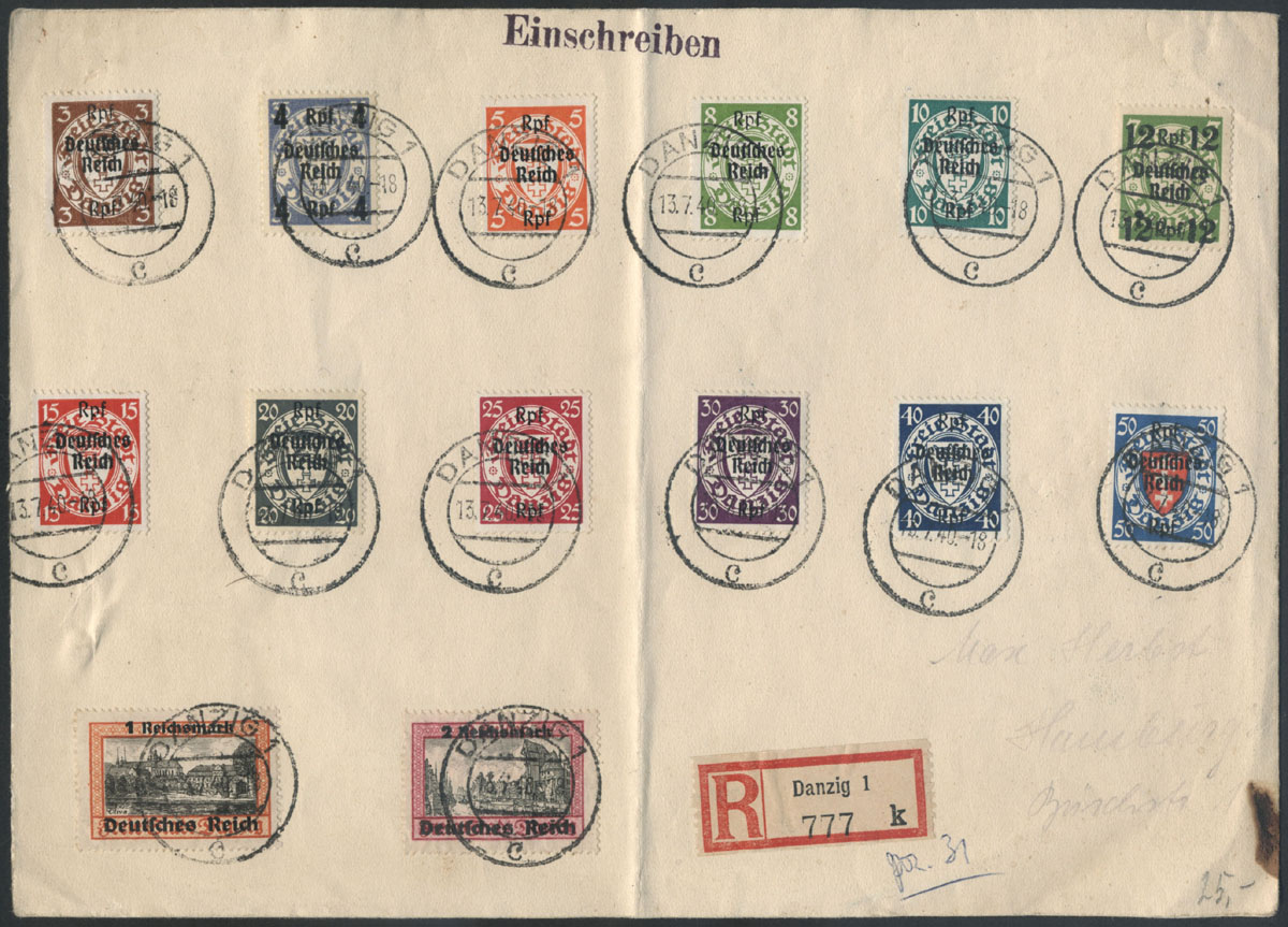 1940 przyłączenie Wolnego Miasta Gdańska do Rzeszy - nadruk "Deutsches Reich" na obiegowych znaczkach poczty WMG, seria kasowana na kiście poleconym do Niemiec, na odwrocie stempel odbiorczy. | Mi.716-29 |