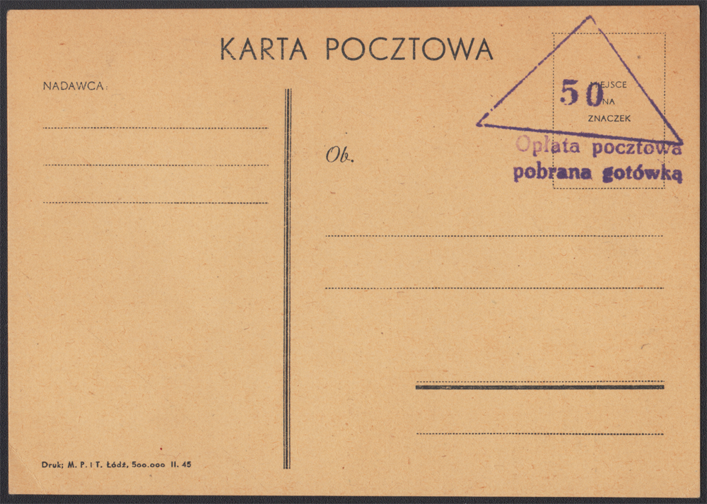 1945 formularz służbowy - przedwojenna karta pocztowa (Jagiellończyk - Cp83) z zadrukowanym znakiem opłaty (por. Fischer t.II 2006 s.354), gwarancja. | Fi.CfpU4 |