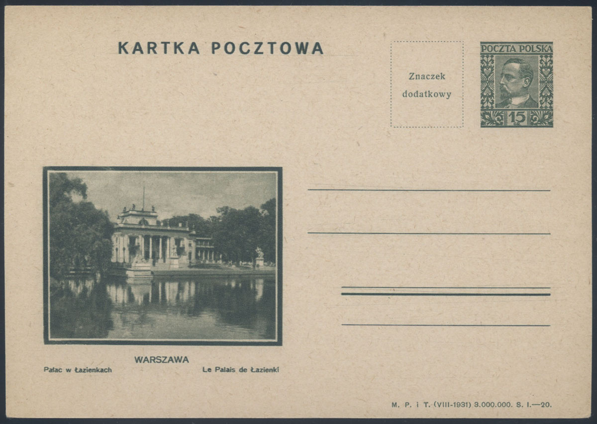 1931 wydanie ilustrowane - Henryk Sienkiewicz, całostka o większym formacie z ilustracją nr 24 bez sygnatury z stemplem "WZÓR" na znaku opłaty, kartki z tym nadrukiem wydała poczta polska dla celów okazowo reklamowych, lekko zdwojony druk rotograwiurą. | Fi.Cp50IIb WZÓR |