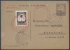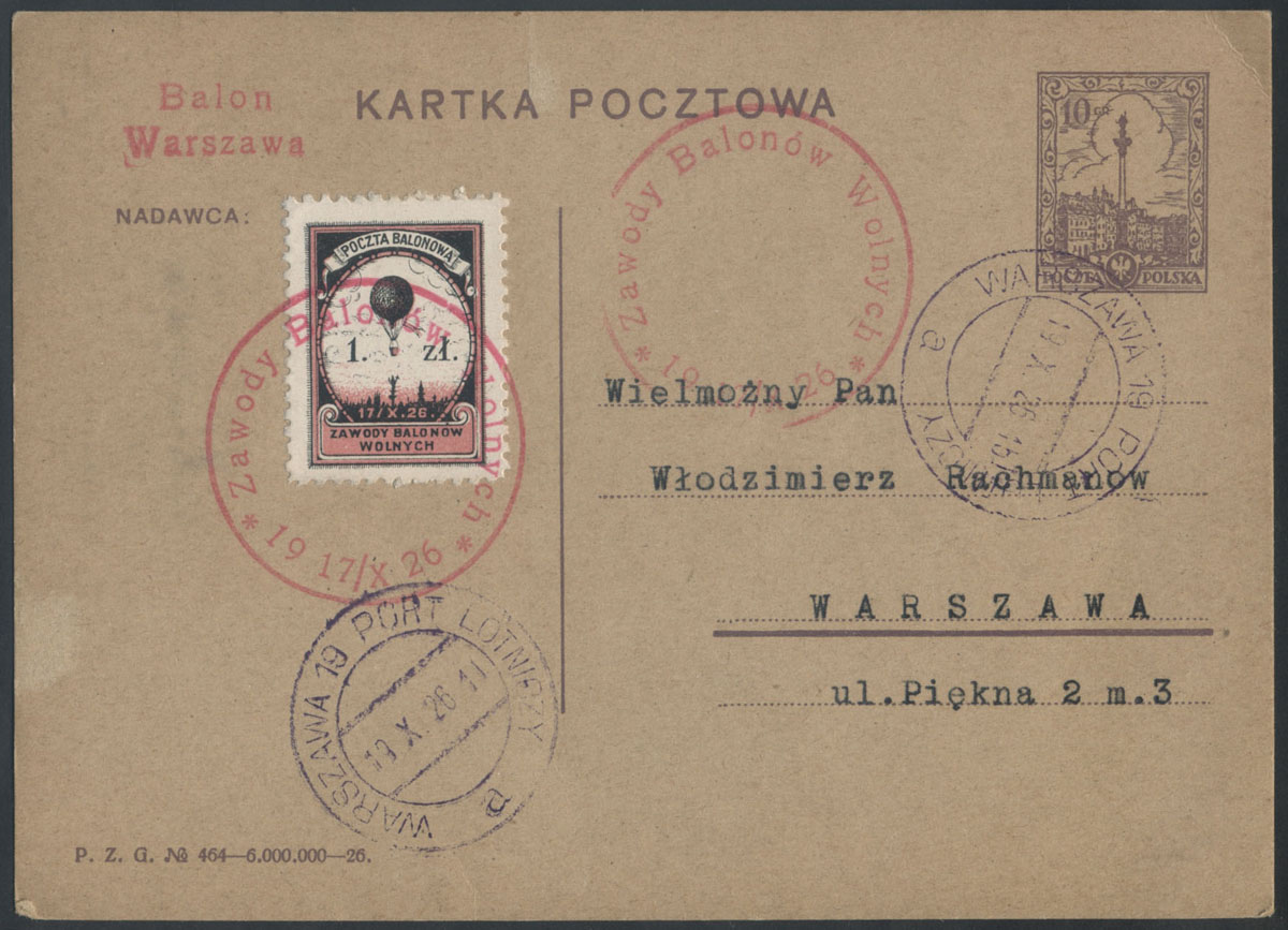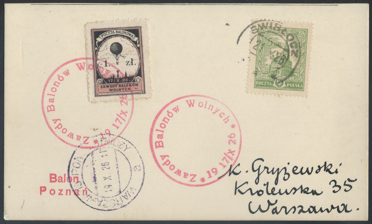 1929 Międzynarodowe Zawody Balonów Wolnych w Poznaniu, balon "Warszawa" pilotowany przez por.Franciszka Hynka, karta z nalepką z tekstem polskim z nadrukiem "Międz. Zawody Balonowe" przewieziona na trasie Poznań - Termsdorf k.Berlina, do polskiej frankatury doklejony znaczek niemiecki, oba unieważnione datownikiem Teupitz koło Teltow z datą 17.8.1929; podpis pilota por.Hynka na froncie; niezwykle rzadki walor - przewieziono jedynie 50 sztuk poczty!!! wysoka wycena katalogowa (Fi.4000,-); dekoracyjna całość w doskonałym stanie zachowania. | Fi.4d |