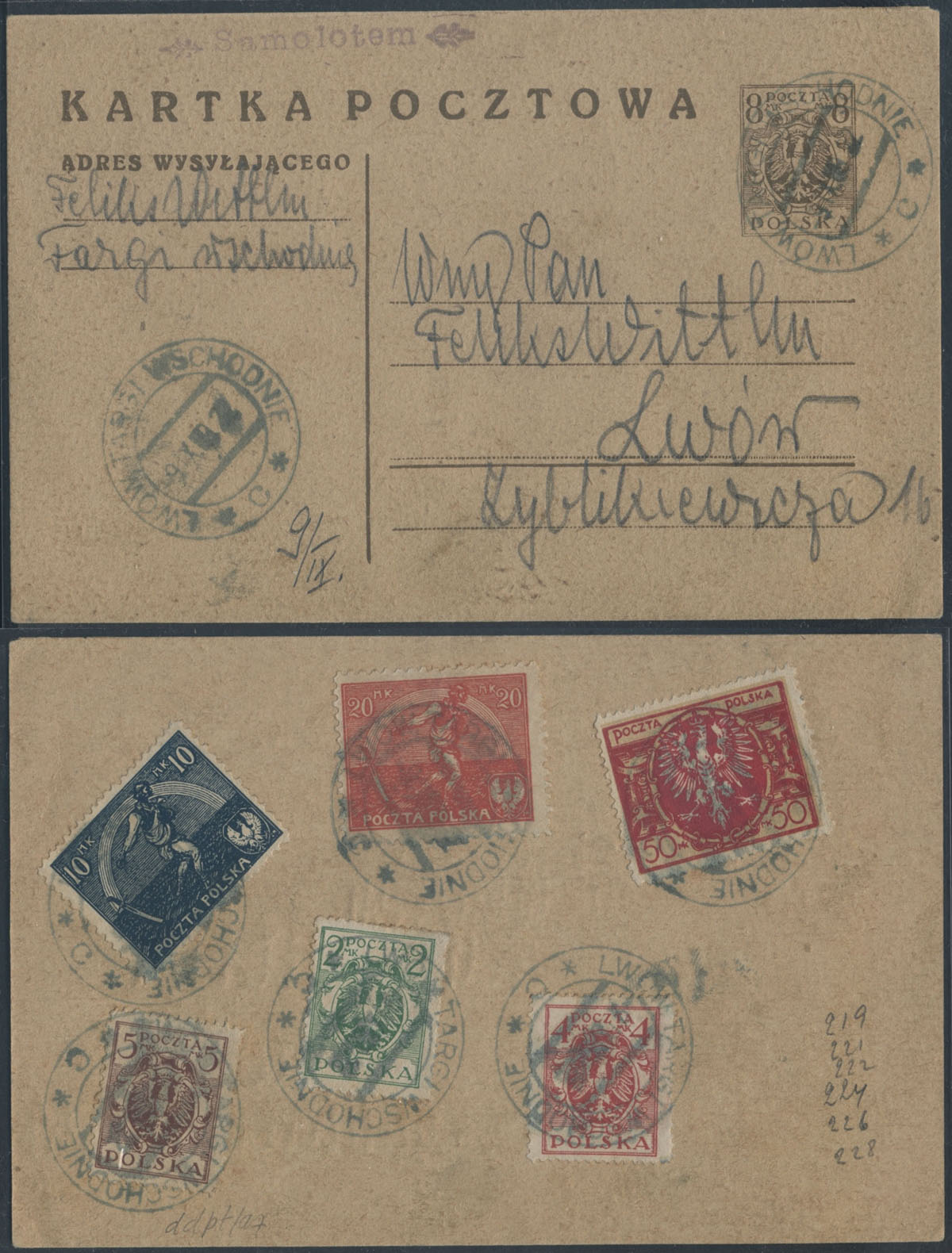 1922 miejscowo adresowana kartka z Lwowa ze stemplem "LWÓW TARGI WSCHODNIE" oraz stempelkiem "Samolotem" bez dodatkowej opłaty za przewóz pocztą lotniczą. | Fi.16f |