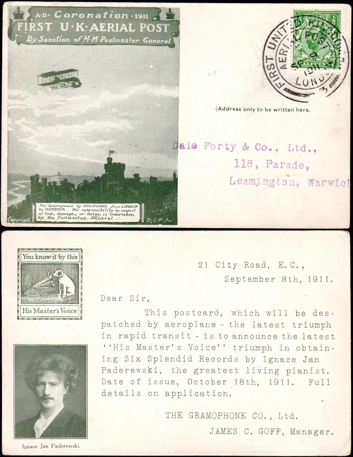 1911 pierwsza poczta lotnicza w Wielkiej Brytanii na trasie Londyn – Windsor, specjalna kartka pocztowa z dodrukiem reklamującym płyty gramofonowe naszego rodaka Ignacego Jana Paderewskiego, największego wówczas żyjącego pianisty. | |
