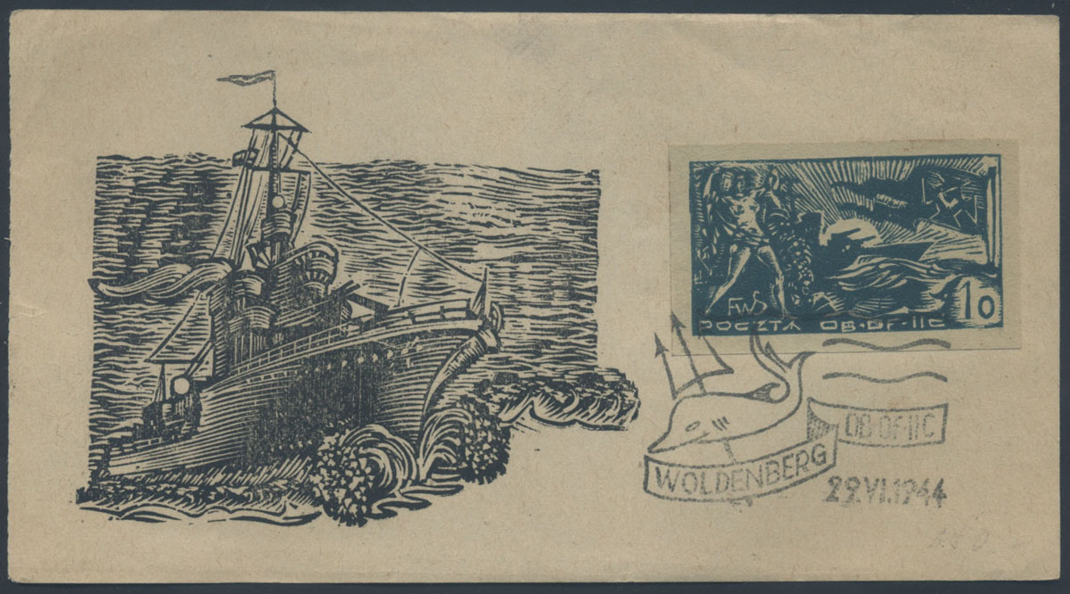 1944 Święto Morza, znaczek skasowany okolicznościowo 29.VI na karcie ozdobionej drzeworytem autorstwa Zygmunta Pazdy, przedstawiającym polski niszczyciel ORP "Błyskawica"; słabszy stan zachowania; gwarancja Krawczyk. | Fi.40 |