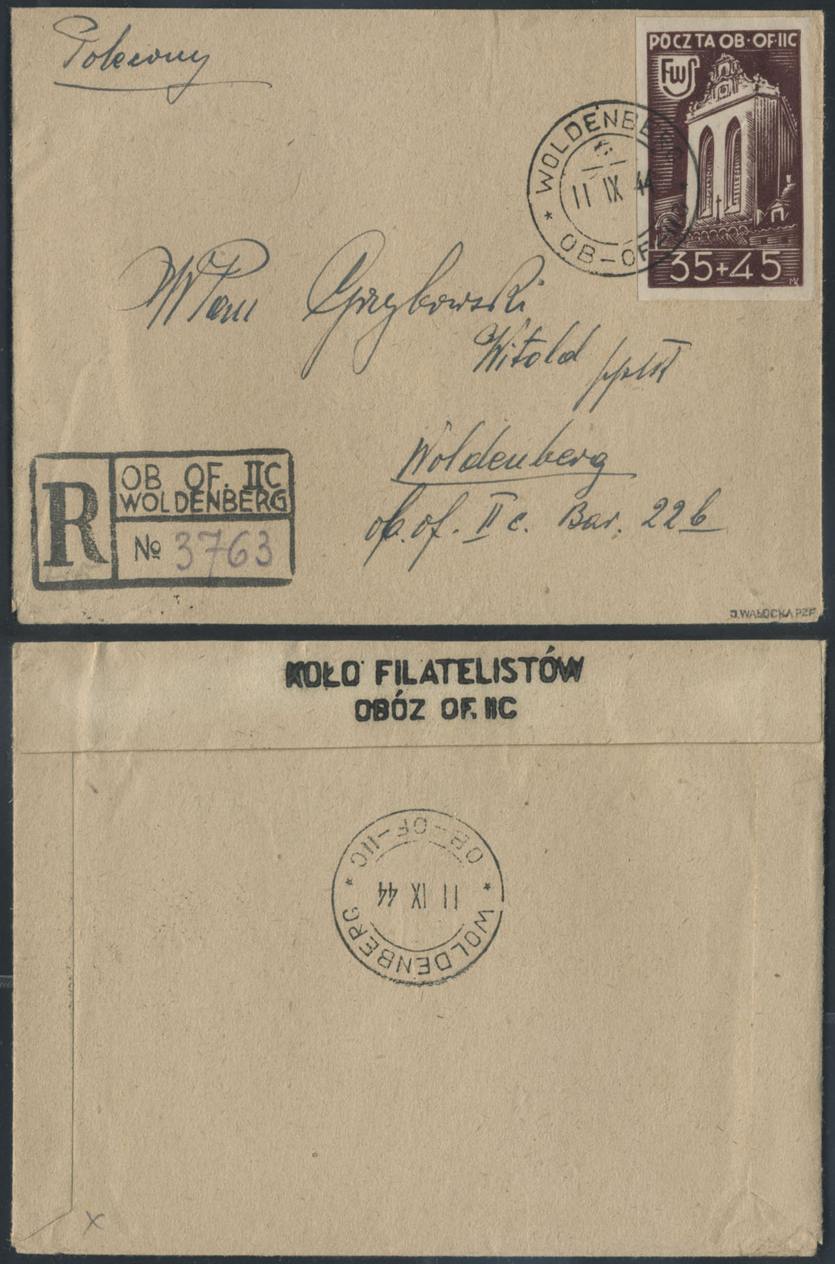 1944 list polecony z Koła Filatelistów, na odwrocie stempelek "KOŁO FILATELISTÓW OBÓZ OF. IIC" i stempel odbiorczy, gwarancja. | Fi.44 |