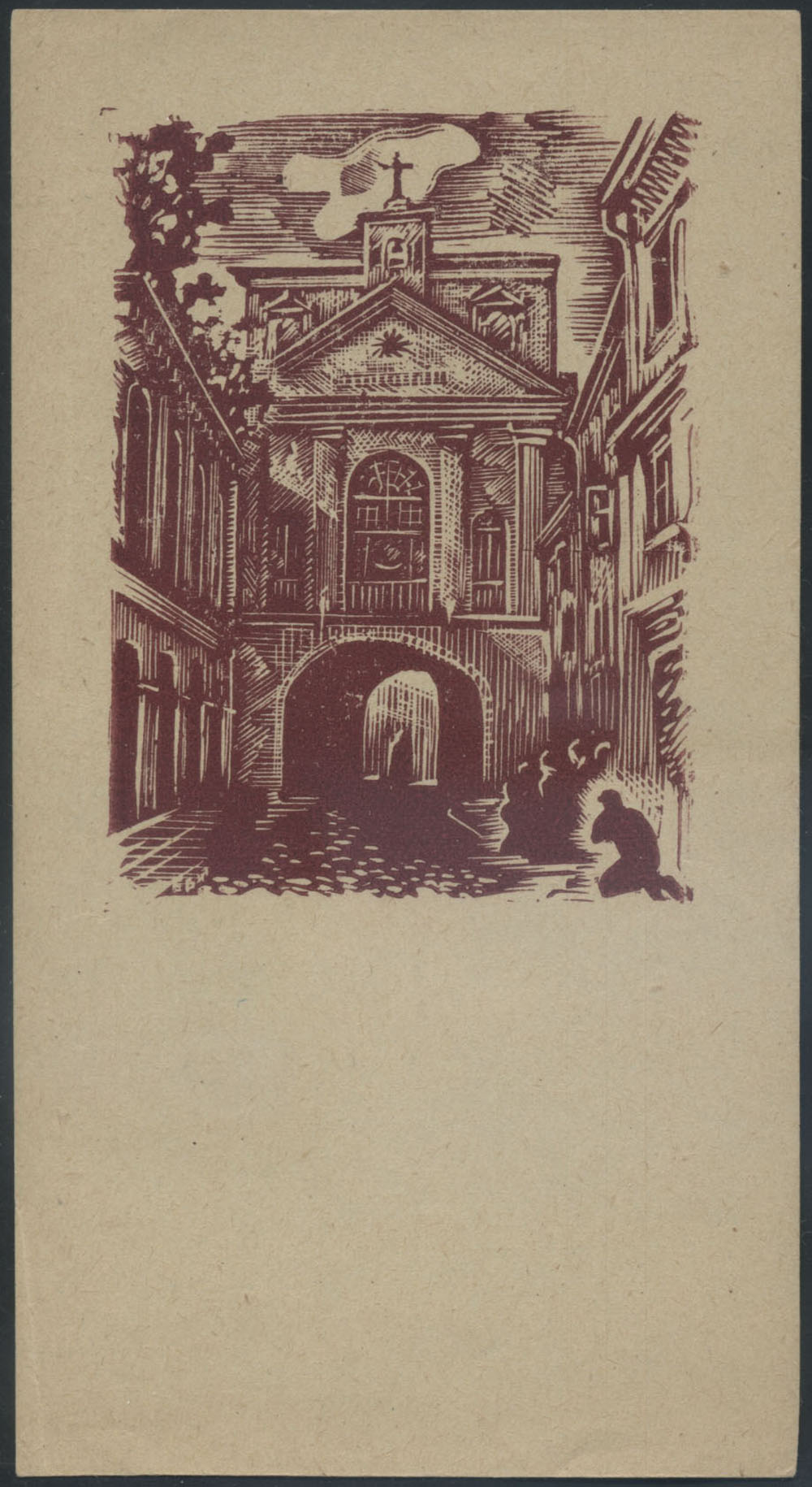 1944 grafika z Ostrą Brama w Wilnie, na odwrocie napis "POCZTÓWKA". | |