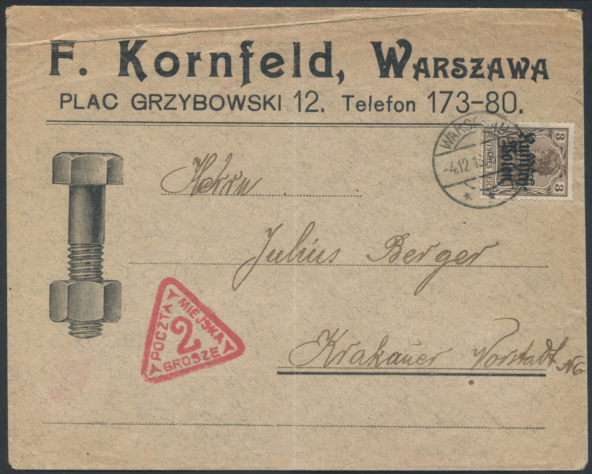 1916 Warszawa, miejscowy list urzędowy władz niemieckich wysłany 14.8, opłatę za przesyłkę pokrywał adresat, wysokość tej należności określał stempelek - tu beznominałowy "Pfennig Porto" z dopisaną cyfrą "8", stosowany w okresach przejściowych; opłata pobierana była przez Pocztę Miejską i przekazywana niemieckiemu zarządowi pocztowemu, jednocześnie Poczta Miejska pobierała własną należność za doręczenie, udokumentowane znaczkiem za 6/5 gr skasowanym stemplem z syrenką; na odwrocie pieczęć listowa nadawcy; całość w dobrym stanie zachowania. | Fi.10 |