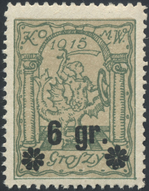 1916 Warszawa, znaczek w barwie jasno szarozielonej z tłem jasno szarożółtym, gwarancja i opis Walocha. | Fi.10 |