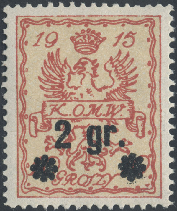 1916 Warszawa, znaczek w barwie czerwonej z tłem jasno szarawożółtym, gwarancja i opis Walocha. | Fi.9 |