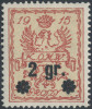 1916 Warszawa, wydanie z typograficznym nadrukiem nowej wartości, kasowany znaczek 2/10 gr. z błędem nadruku na poz.28 w drugim sektorze "prawa gwiazdka 6-promienna, lewa gwiazdka spłaszczona", gwarancja Krawczyk. | Fi.9at |