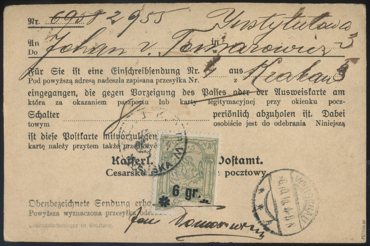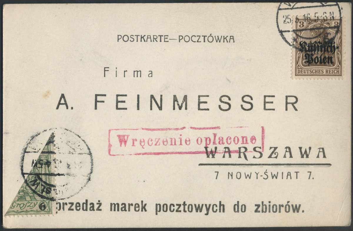 1916 Warszawa, "Do Jaśnie Oświeconej Książęcej Wielmożności Prezydenta m.st. Warszawy" (Zdzisława Lubomirskiego) - miejscowa przesyłka nadana 23.9 z opłaconym przez nadawcę doręczeniem, oznaczona czerwonoliliowym stempelkiem WRĘCZENIE OPŁACONE (98x17mm), z dopiskiem ołówkiem "Ratusz"; rzadki walor w minimalnie słabszym stanie zachowania; gwarancja. Adresat przesyłki - Zdzisław książę Lubomirski w okresie 5.VIII.16–6.X.17 sprawował funkcję prezydenta Warszawy, w późniejszym okresie w trzyosobowej Radzie Regencyjnej Królestwa Polskiego - pełniącej rolę króla Polski, 7.X.1918 książę regent, po 123 latach ogłasza niepodległość Polski, 10.XI wita Piłsudskiego na dworcu w Warszawie, 11.XI jako członek Rady Regencyjnej przekazuje mu władzę wojskową, a 14.XI władzę polityczną; ze stanowiska regenta ustąpił w 1925 roku. | Fi.27IIa |
