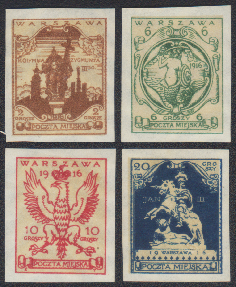 1916 Warszawa, cięta seria pomnikowa, wydanie niedopuszczone do obiegu, wszystkie znaczki z dobrze centrowanym tłem, ładny stan zachowania. | Fi.III-VIA Mi.III-VIB |