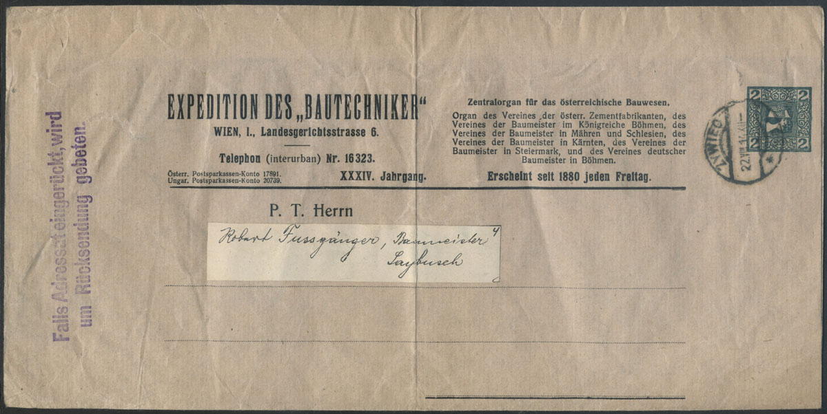 1914 austriacka koperta gazetowa wysłana miejscowo do abonenta w Żywcu, koperta dużego rozmiaru zagięta w połowie. | |