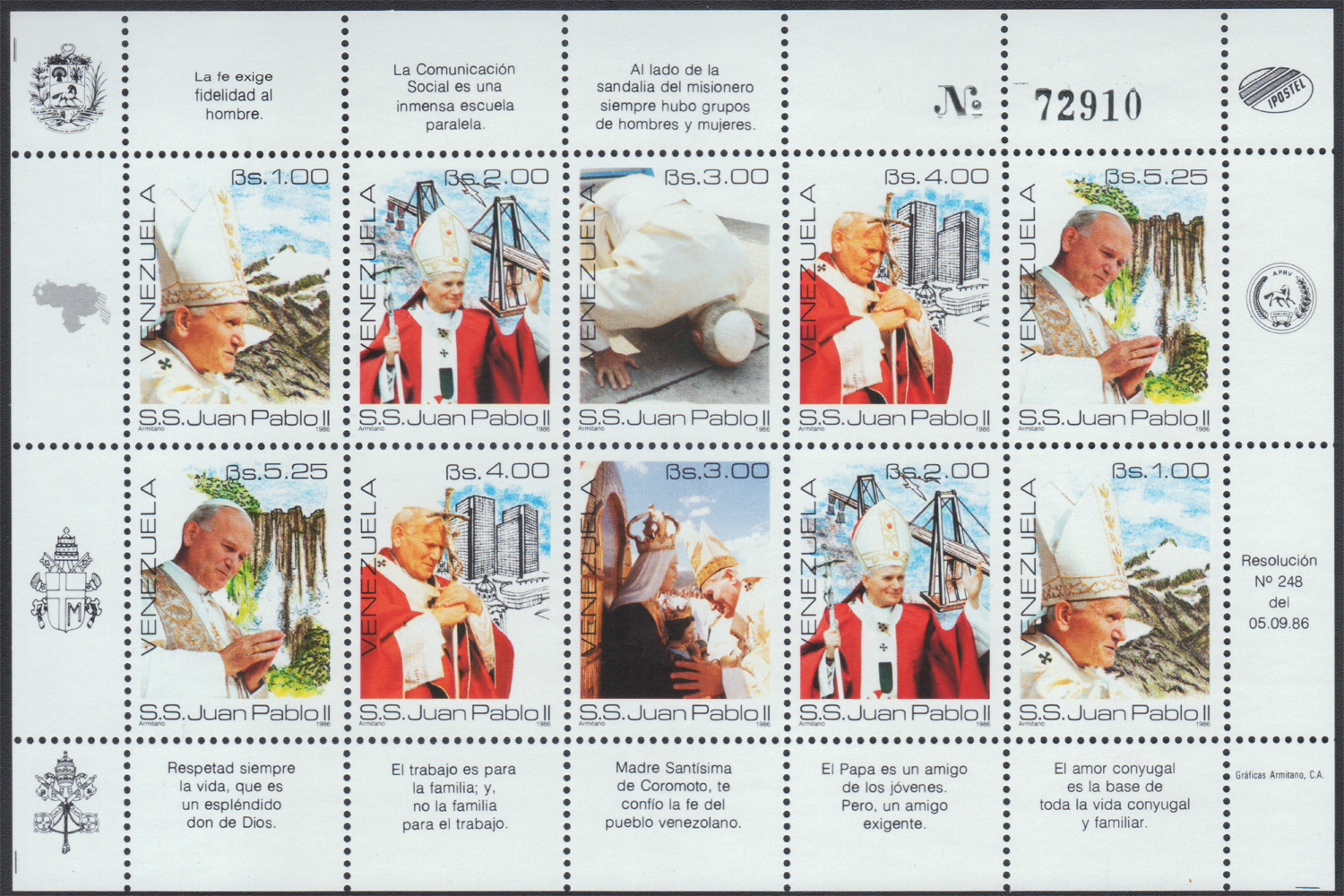 1986 wizyta Papieża Jana Pawła II w Wenezueli, arkusik czysty. | Mi.2375-80 |