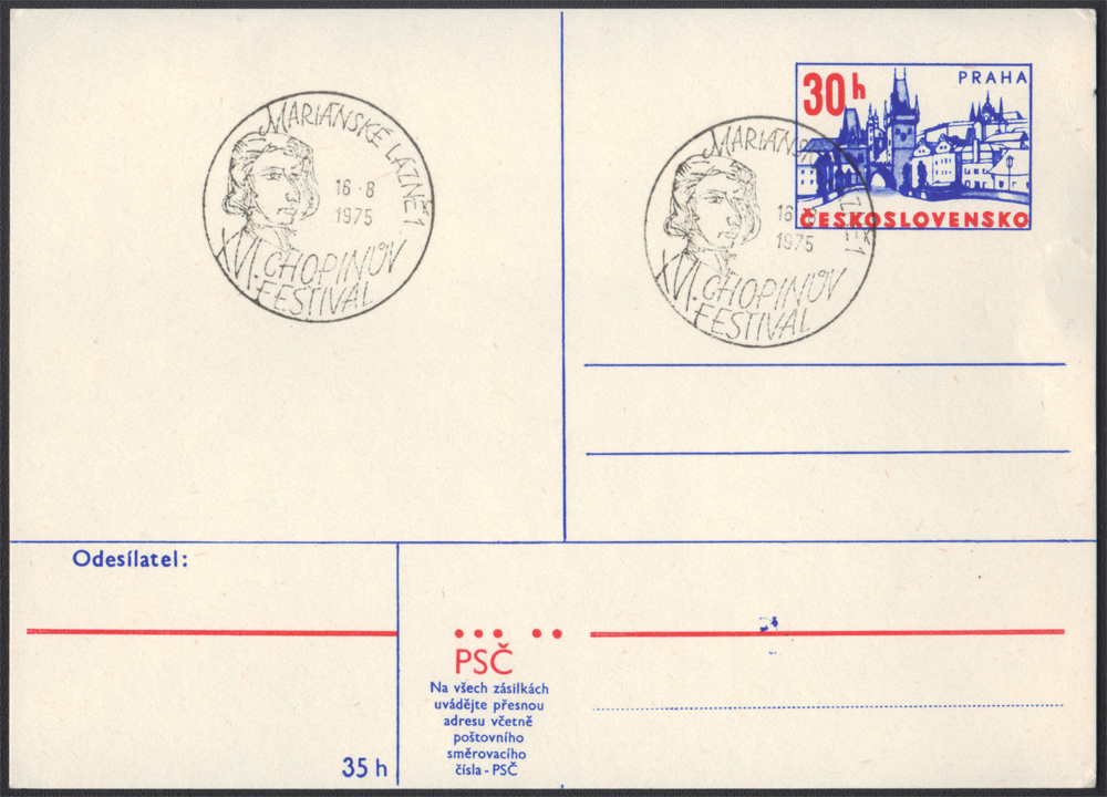 1975 XVI Festiwal Chopinowski w Mariańskich Łaźniach w Czechosłowacji, całostka z kasownikiem okolicznościowym. | |