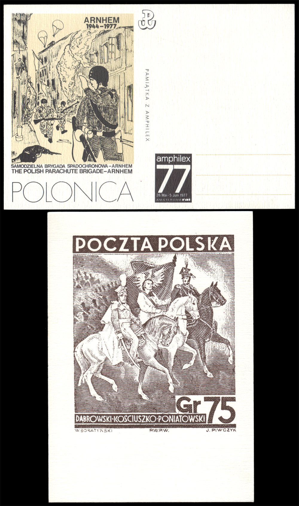 1977 Wystawa Filatelistycznej "Amphilex'77", pamiątkowa kartka upamiętniająca udział 1. Samodzielnej Brygady Spadochronowej w bitwie pod Arnhem, ilustracja z grafiką przedstawiającą scenę walk ulicznych z udziałem spadochroniarzy. | |