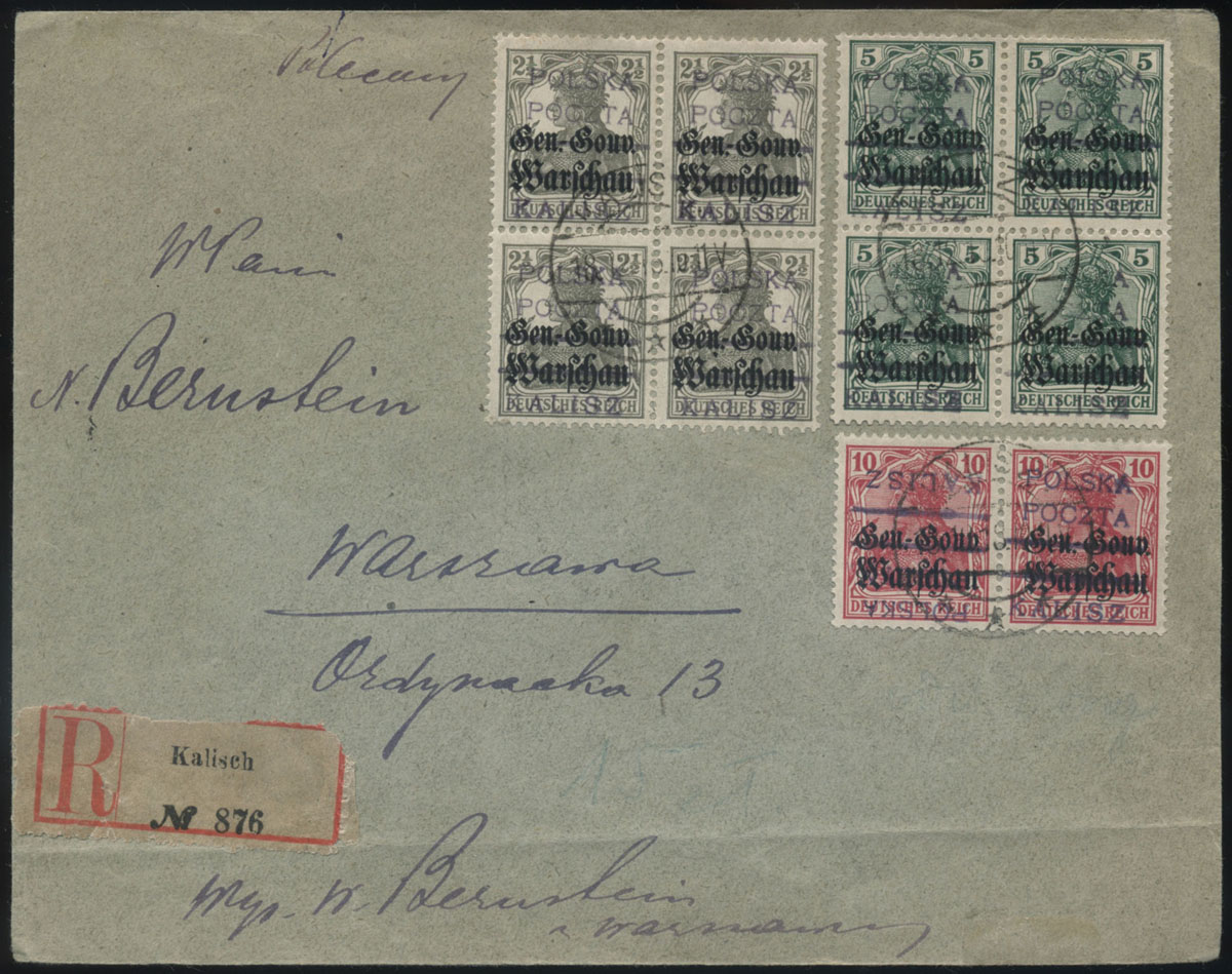 1918 Kalisz, list polecony prawidłowo opłacony z Kalisza nadany 18.12.18 do Warszawy, list opłacony znaczkami III wydania, w tym jednym znaczkiem z nadrukiem odwróconym, na odwrocie stempel odbiorczy. | |