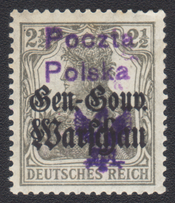 1918 Ciechocinek, kasowany znaczek okupacji niemieckiej - "Gen.-Gouv. Warschau" za 10 fen. z unikalnym lokalnym nadrukiem, według Włodzimierza Rachmanowa (cytat): to najrzadsze wydanie lokalne z tego okresu, znane z kilku lub nawet w pojedynczych egzemplarzach każdej wartości, przedrukowano je gumowym stempelkiem "PoczTa poLska" złożonym z pojedynczych liter i wobec braku odpowiednich małych użyto również w środku litery duże; nadruk jest czysto fioletowy, przeważnie dość słabo odbity; odkryte zostały stosunkowo późno, bo pierwszy znaczek wartości 10 fen., który zobaczyłem dostałem od mego przyjaciela p.Kazimierza Gryżewskiego dopiero w roku 1927; znaczek ten p.K.Gr. znalazł w masówce..;.. dzięki temu, że wydanie to było ukryte prawie 10 lat przed zbieraczami i handlarzami, nie zdołano zrobić "drugich wydań" lub nowodruków, dzięki czemu wydanie to, jak już zaznaczyłem, uważam za najbardziej solidne i rzadkie ze wszystkich wydań lokalnych PP na GGW; bardzo ciekawy egzemplarz, po prawej litera P z nadruku na sąsiednim znaczku, zachowany w pięknym stanie; super pochodzenie - z tego samego źródła co pierwszy odkryty, gwarancja firmowa Gryżewski, gwarancja Schmutz. | Fi.4 |
