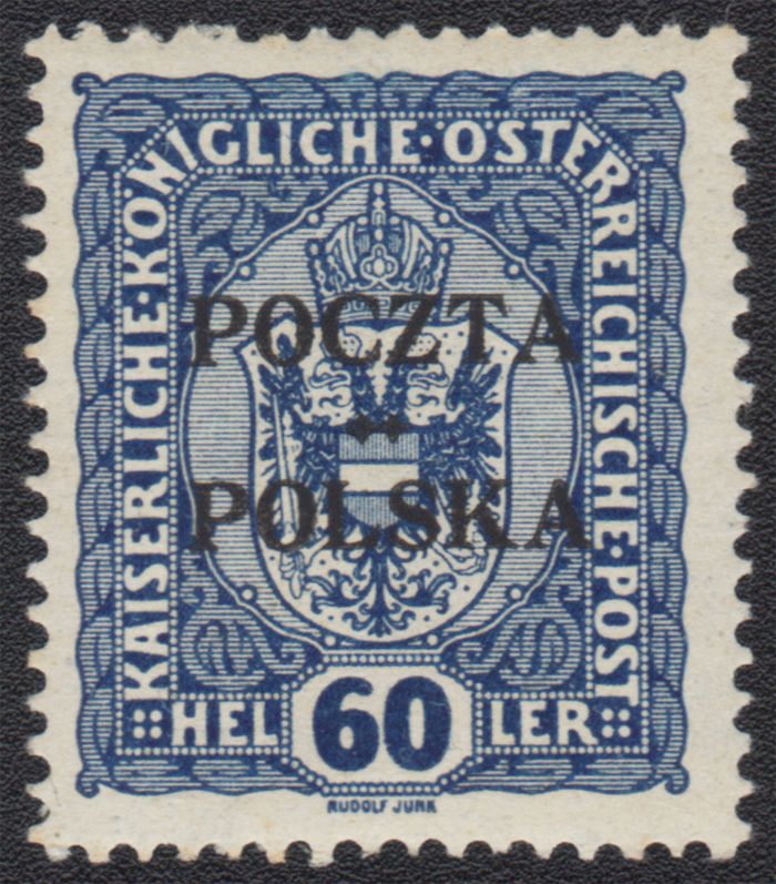 1919 wydanie krakowskie, znaczek za 60 hal. z nadrukiem pierwszą formą z usterką na poz.91 "uszkodzone P w POLSKA" (to narożna litera całej formy przedrukowej), gwarancja i opis Schmutz. | Fi.42 Mi.40 |