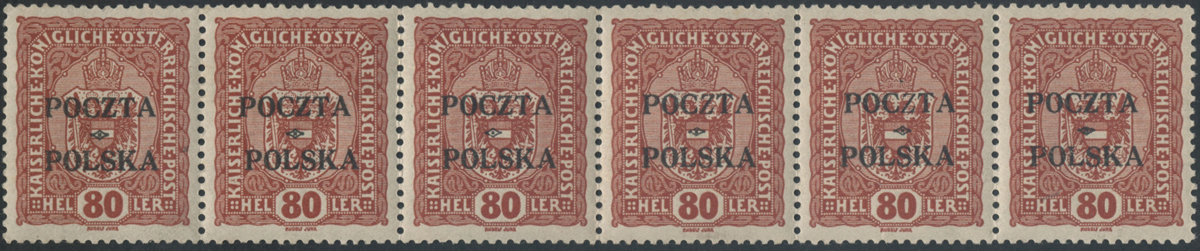 1919 wydanie krakowskie, pasek znaczków z nadrukiem pierwszej formy z poz. 21-26, dwa znaczki z błędem "cienkie Z", gwarancja Danowski. | Fi.43B1 Mi.41 |