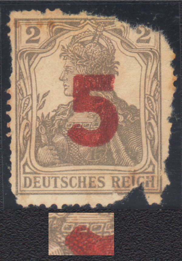 1919 wydanie gnieźnieńskie, kasowany w Strzałkowie znaczek za 5/2 fen. z błędem występującym na dwunastu pozycjach w arkuszu w nadruku typu VI "łukowata plamka w zakończeniu cyfry 5", zdjęty z listu nad parą, lekko przesycony klejem i z niewielkimi pozostałościami papieru z koperty na odwrocie, ale za to nadruk zachował swoją naturalna barwę, gwarancja z oznaczeniem Petriuk BPP. | Fi.71 Mi.135 |