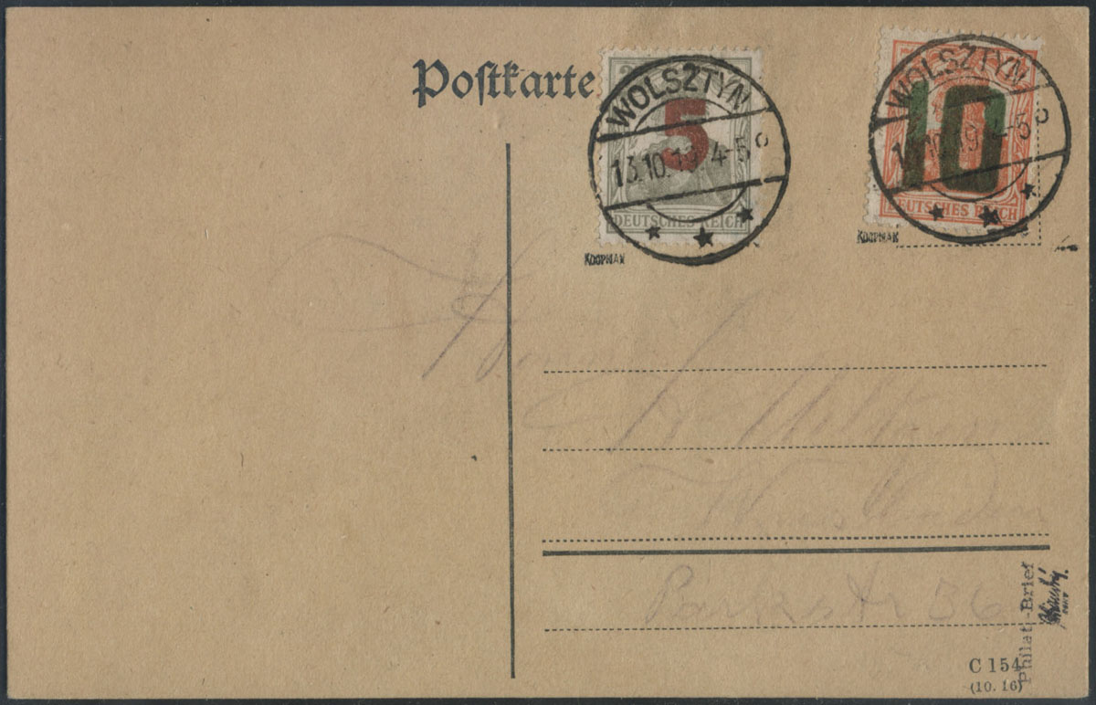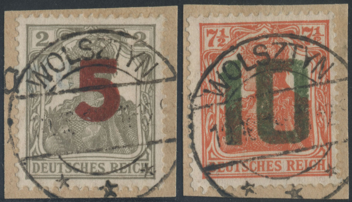 1919 wydanie gnieźnieńskie, seria stemplowana na kartce kasownikiem Wolsztyna, znaczek za 5 fen. nadruk typu 6, znaczek za 10 fen. nadruk z poz. 99, gwarancja Koopman, i z oznaczeniem (na odwocie) Landré. | Fi.72-3 Mi.135-6 |